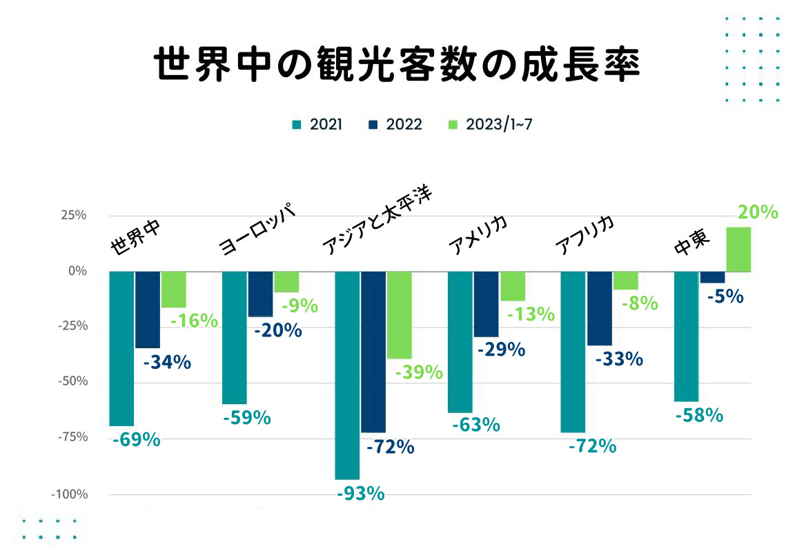 世界観光機関の最新データによると、2023年1月から7月までの世界中の観光客数は2019年の同時期の84%に達し、アジア及び太平洋地域が61%で、アフリカ、ヨーロッパやアメリカ大陸などの地域はアジアよりも早く回復しており、87~92%となっています。中東地域はさらにその傾向が強く、コロナ禍前の水準を20%以上超えた唯一のエリアとなっています。世界観光機関の専門家の半数以上が、旅行マーケットは2024年に完全に回復すると見ています。