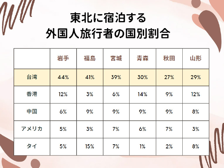 東北地方では、街中で出会う外国人観光客の3人に1人が台湾人観光客であり、その主な理由は台湾と東北地方を結ぶ直行便が複数あり、乗り継ぎや移動の費用が不要なためだと考えられます。