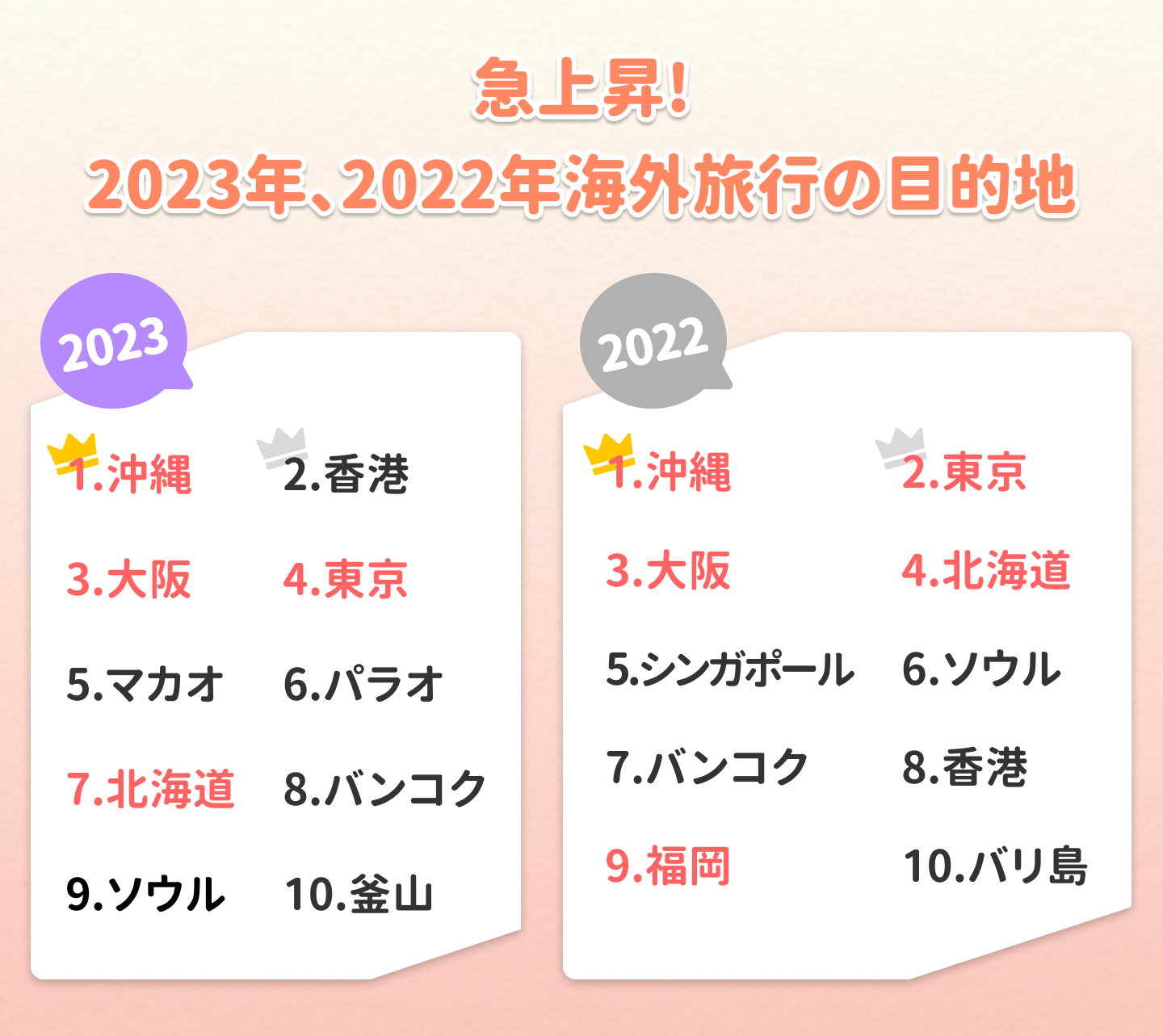 Googleは、12月11日に台湾の「2023年検索ランキング」を発表しました。過去1年間に最も人気のある検索キーワードが分かります。「海外旅行の目的地」をテーマにした統計データを2022年と2023年で比較すると、「沖縄」が2年連続でトップとなり、知名度の高い東京、大阪、北海道も2年連続でランクインしましたが、今年は若干順位が下がりました。福岡は、今年はランクインを逃しました。