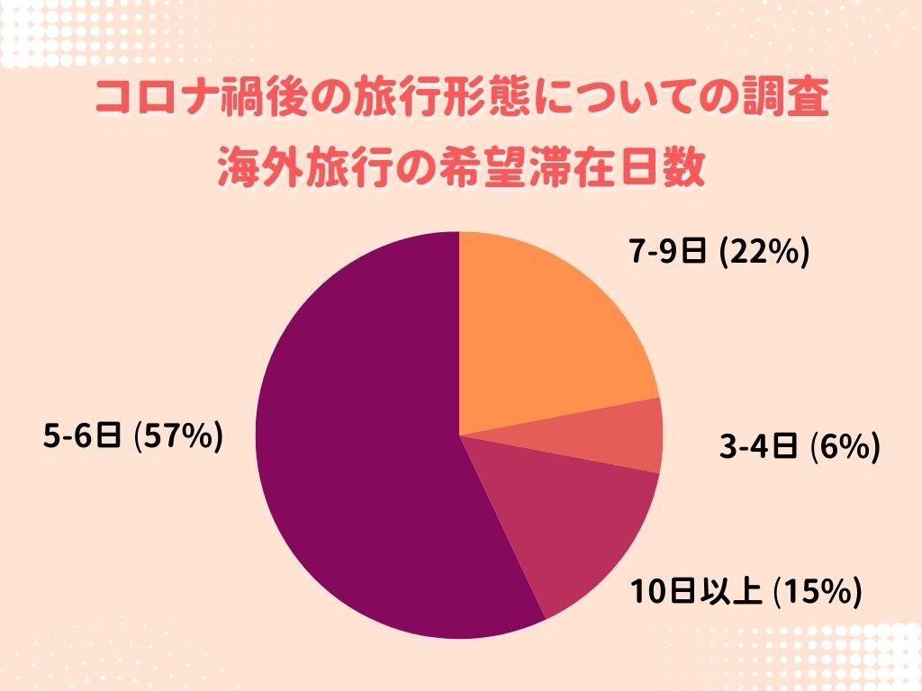 今まで台湾人の海外旅行は、長期旅行を除いて4~5日の旅程を組むのが一般的でしたが、コロナ禍収束後は台湾人が計画している滞在日数は徐々に長くなっています。