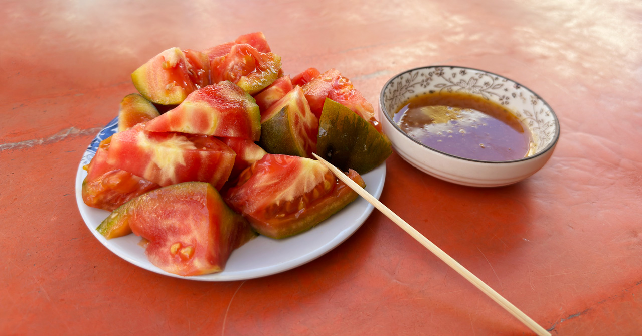 台湾のトマトの食べ方は、北と南で大きく異なり、北部の人は梅粉や甘草粉をつけて食すのに対し、南部の人は大きなトマトを角切りにして特製のソースと混ぜて食べます。