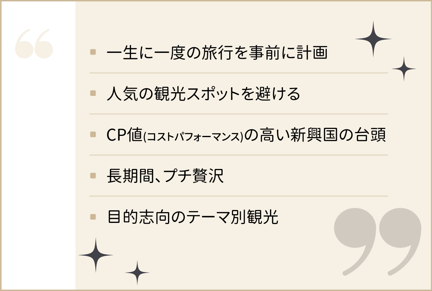 以前は、若者は人気の観光スポットや国を優先する傾向がありましたが、現在はユニークな旅行やテーマのある旅行スタイルを好む傾向にあります。