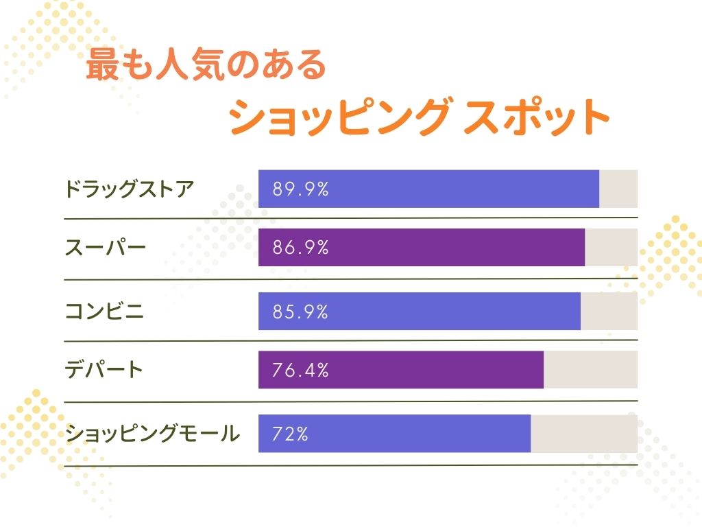 訪日観光情報サイトが実施したオンライン調査によると、訪日台湾人の9割近くがドラッグストアで商品を購入しており、最も多く購入している商品は洗顔料、歯磨き粉、日焼け止めです。また、スーパーマーケットやコンビニエンスストアもよく利用し、旅行者の7割以上が様々なブランド商品を購入できるデパートやショッピングモールを選んでいます。
