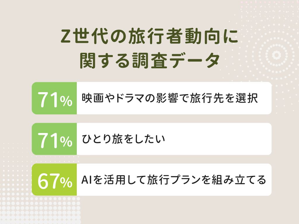 台湾の1997年から2012年に生まれた「Z世代」の総人口は、377万人です。旅行業界運営会社Booking.comの「Z世代旅行者動向調査」によると、Z世代旅行者の71%以上が「映画やドラマ」を理由に旅行先を選んでいます。「映画やドラマのような体験」を楽しみにしており、約71%がひとり旅に挑戦してみたいと回答しています。そして約67%が旅行を計画する際、AIを活用することに前向きな意見を持っています。