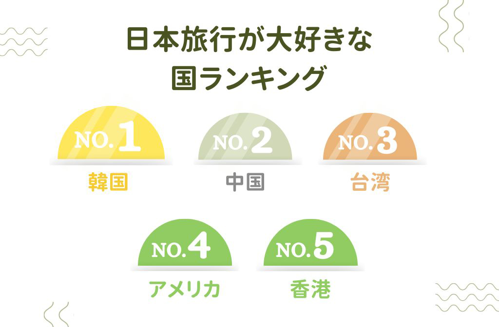 日本旅行を最も愛する国のランキングでは、韓国、中国、台湾がトップ3を占めています。2024年11月には、韓国が74.9万人で1位、中国が54.6万人で2位、台湾が48.8万人で3位にランクインしました。4位はアメリカ(24.7万人)、5位は香港(22.7万人)でした。