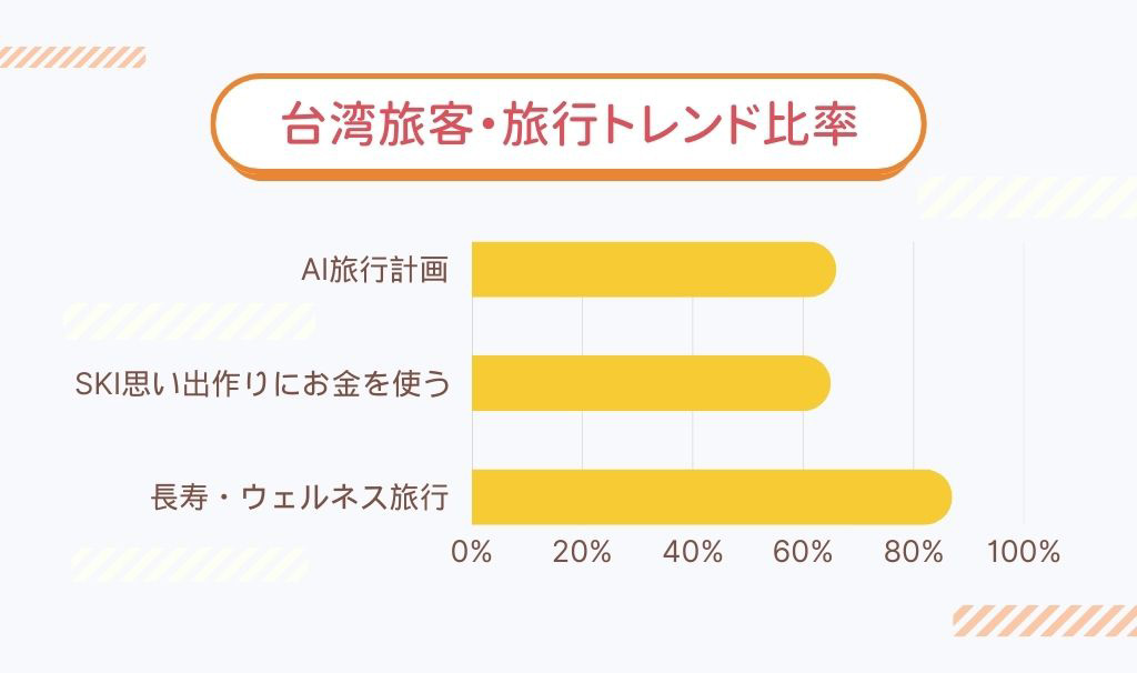 日本旅行の人気は依然として衰えず、沖縄は定番の目的地として根強い人気がある一方で、熊本や高知が急浮上し、台湾の旅行者の新たな注目スポットとなっています。これは、日本旅行に対する台湾消費者の多様なニーズと嗜好を反映しており、事業者がより精度の高い商品・サービスを企画することで、新たな旅行需要を生み出すチャンスとなります。