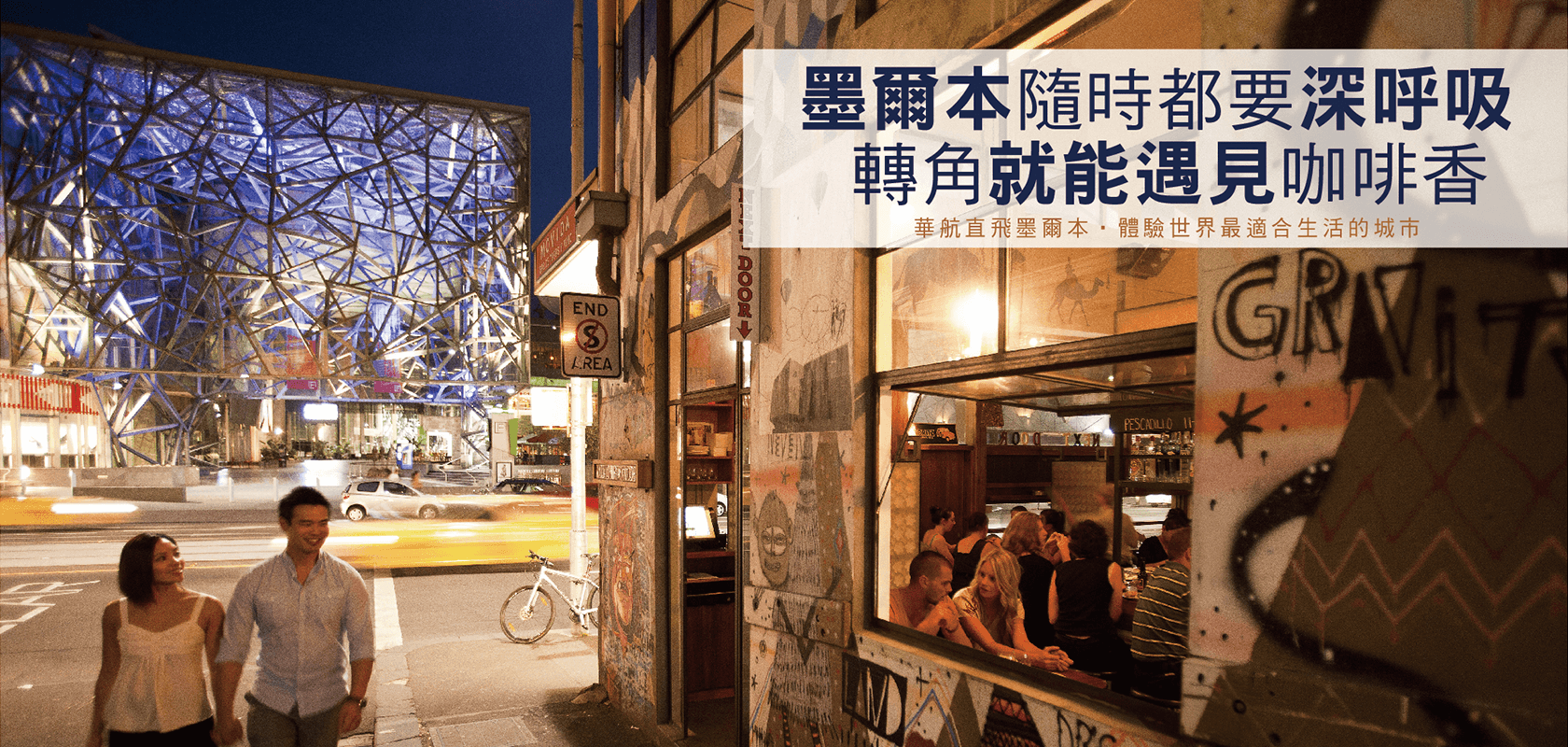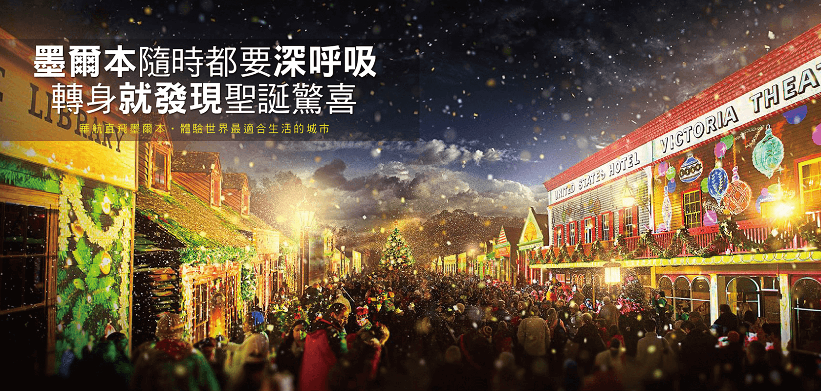 文化之都墨爾本,曾連續7年蟬聯「全球最宜居城市」之冠!以迷人的咖啡香、南半球限定七月聖誕節以及國際藝術節聞名,以「轉身就遇見」的概念傳遞墨爾本充滿各種驚喜,運用不同宣傳方式,以這些旅遊亮點為主軸作推廣,吸引消費者前往旅遊。搭配異業合作及實體活動搶攻不同族群市場。